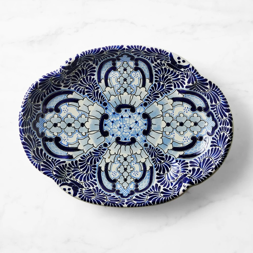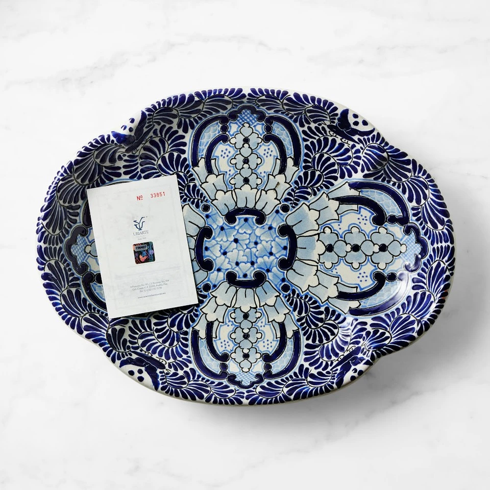 Crafted according to Talavera de Pueblatradition by one of Mexico’s premier ceramic makers, our Azulete platter features a classic design from the 19th century. Each piece is made from high-fired black and white clays, handpainted with intricate cobalt designs and finished with a clear, protective glaze. A stunning gift, the platter offers beautiful presentation for a range of food, from appetisers and tapasto main dishes and desserts.