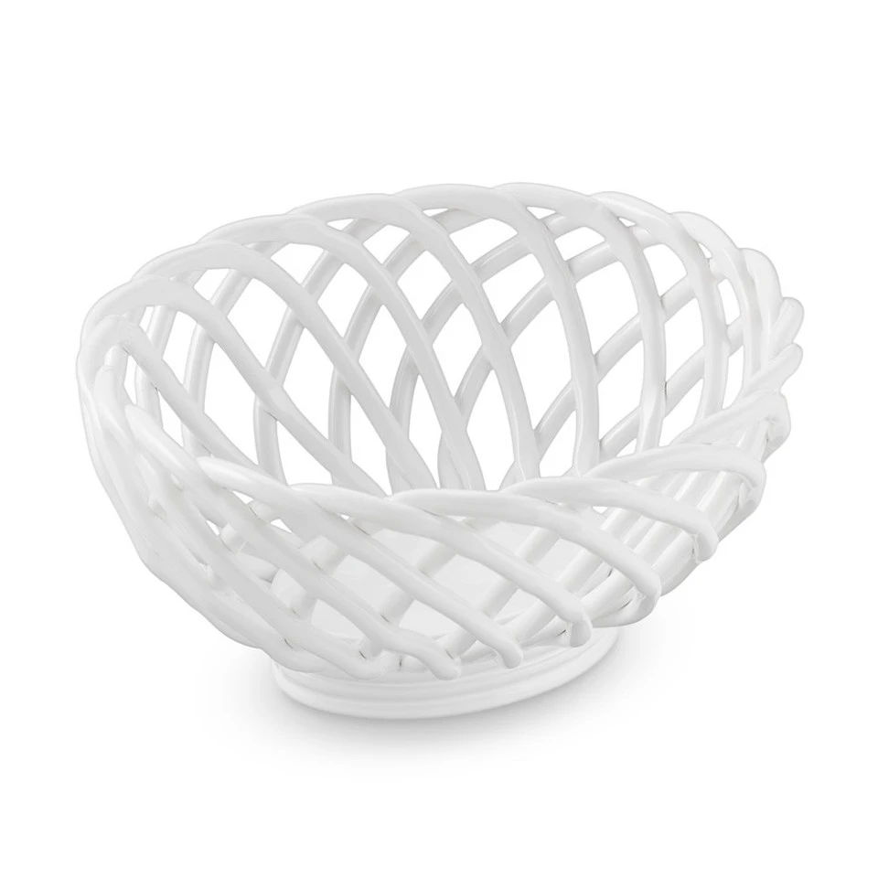 Baked goods stay warm at the table tucked inside our heated stoneware basket. A longtime favorite of our customers, the well-proportioned oval basket’s woven design is hand crafted of earthenware and finished with a white glaze. Place the basket in a 80°C oven for approximately 15 minutes; carefully remove and line with a cloth napkin before filling with warm bread or muffins. The thick base will continue to gently radiate heat.