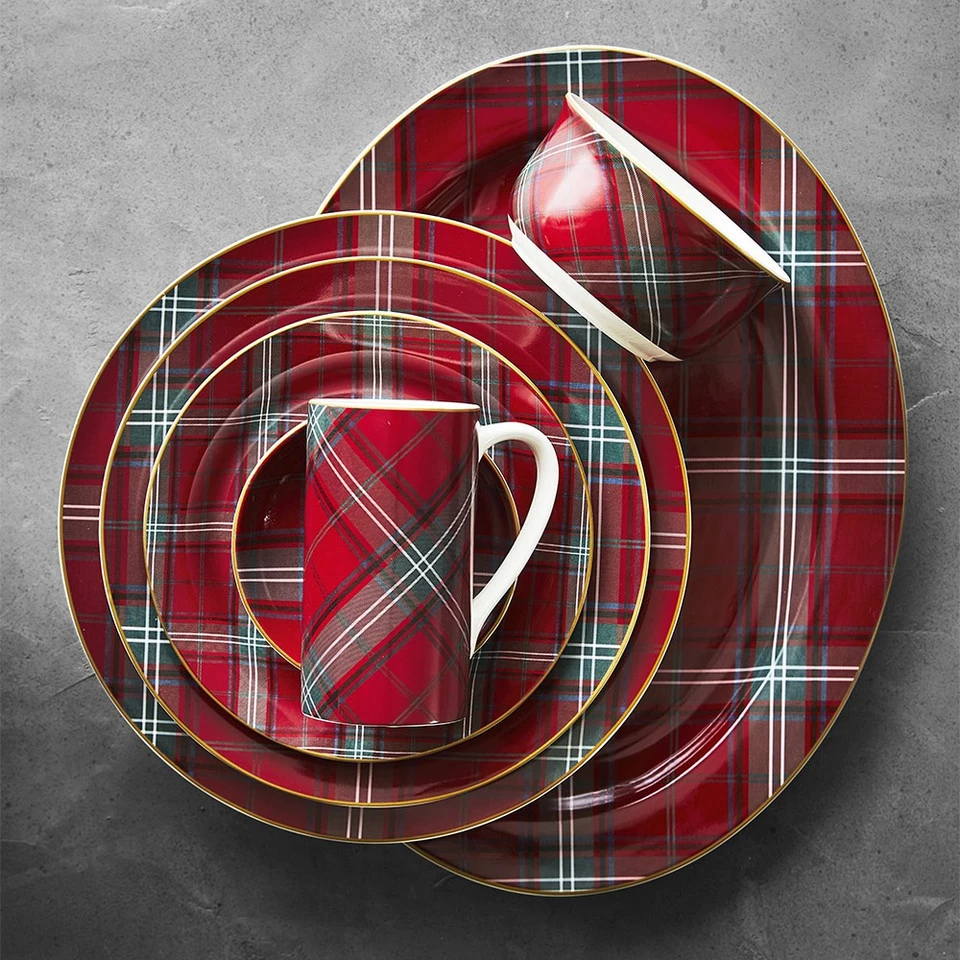 Welcome guests to a very merry table, beautifully set with our festive dinnerware. Embellished with a traditional Scottish tartan pattern, the chargers, plates, salad plates, mugs and espresso cups bring merriment to gatherings.