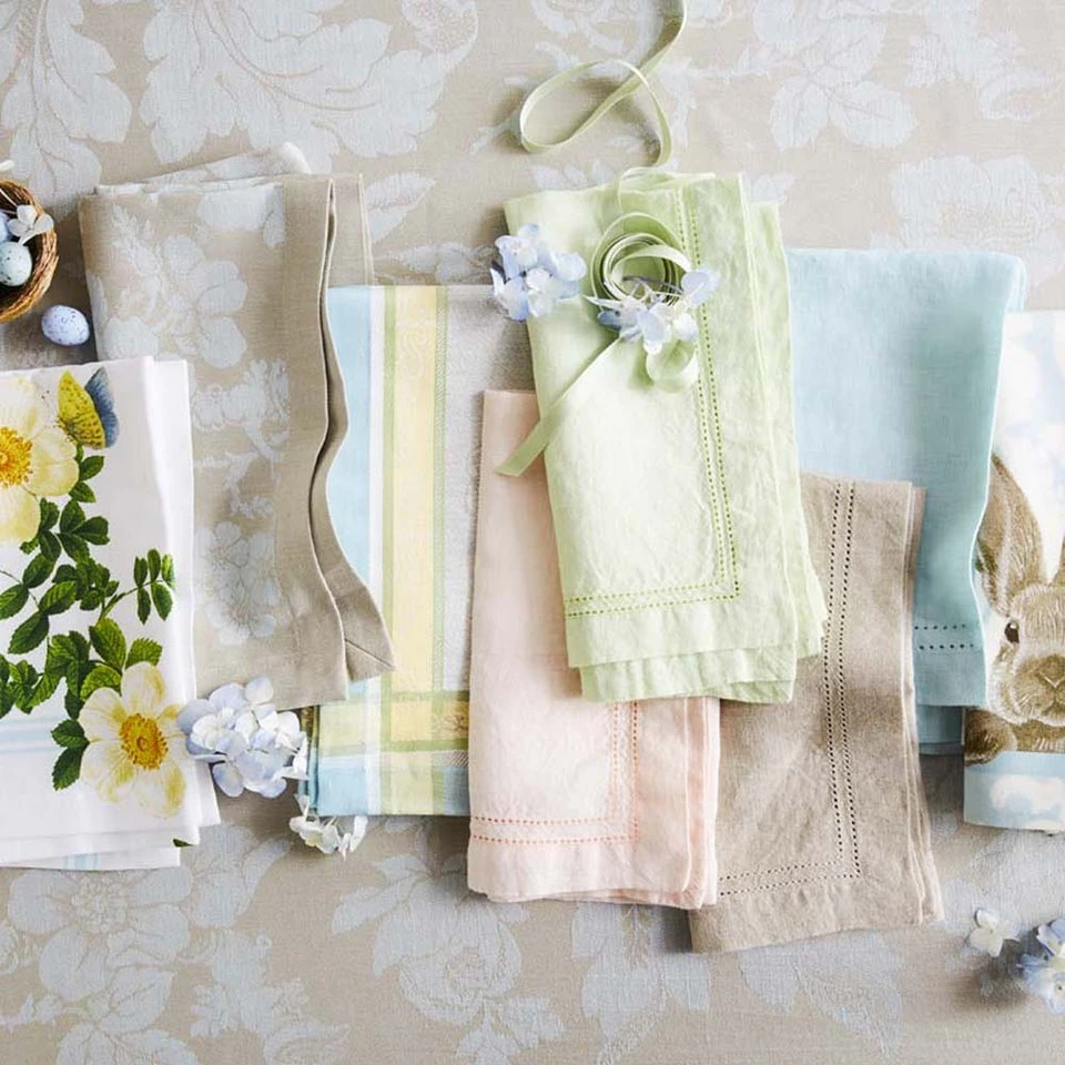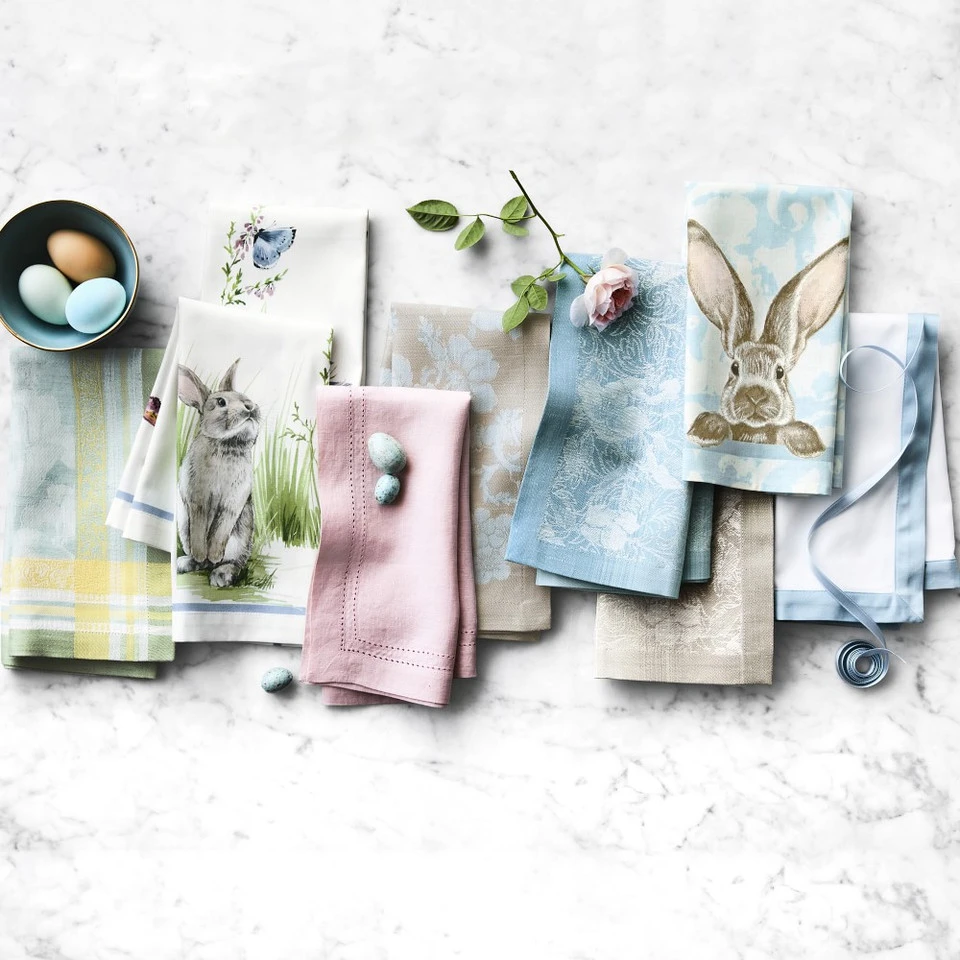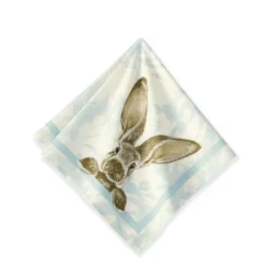 Brighten your Easter celebrations with our vintage-style napkins, decorated with playful portraits of woodland bunnies. Expertly printed for us by a European mill, the design pairs the bunnies with a backdrop of pale blue floral damask for a look that’s both elegant and charming. Pair with other pieces from our Damask Easter Bunny collection, or with any simple white dinnerware.