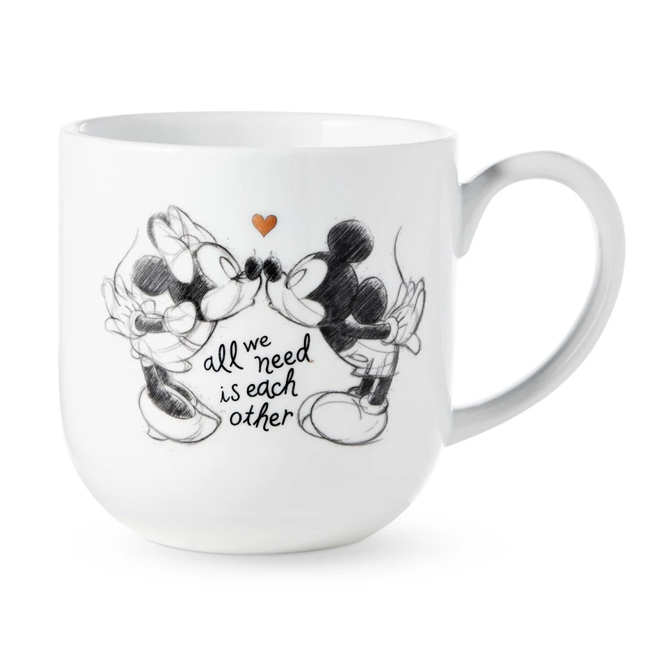 Share a cuppa with Minnie Mouse™, and start your day with love. Crafted of hand-dipped white porcelain, our vintage-style mug is decorated with the iconic cartoon character created by Walt Disney in 1928, a heart and the message “all we need is each other.”