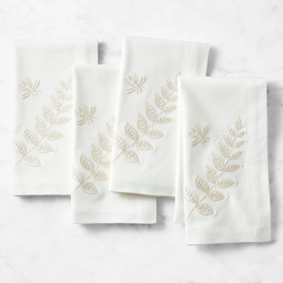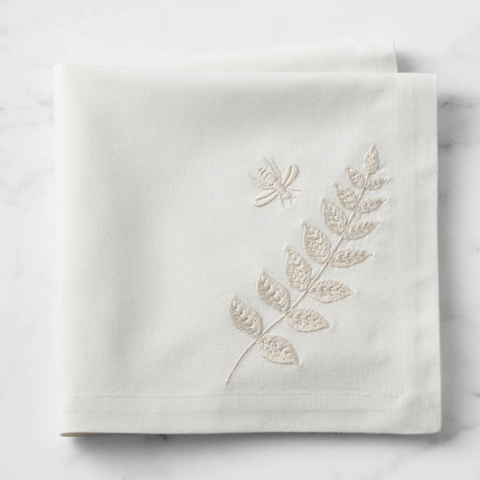 Lush, graceful ferns are embroidered in subtle ivory, bringing soft texture and pattern to our tailored napkins. Woven from sustainably-sourced cotton, they’re finished with mitred corners and an embroidered bumblebee.