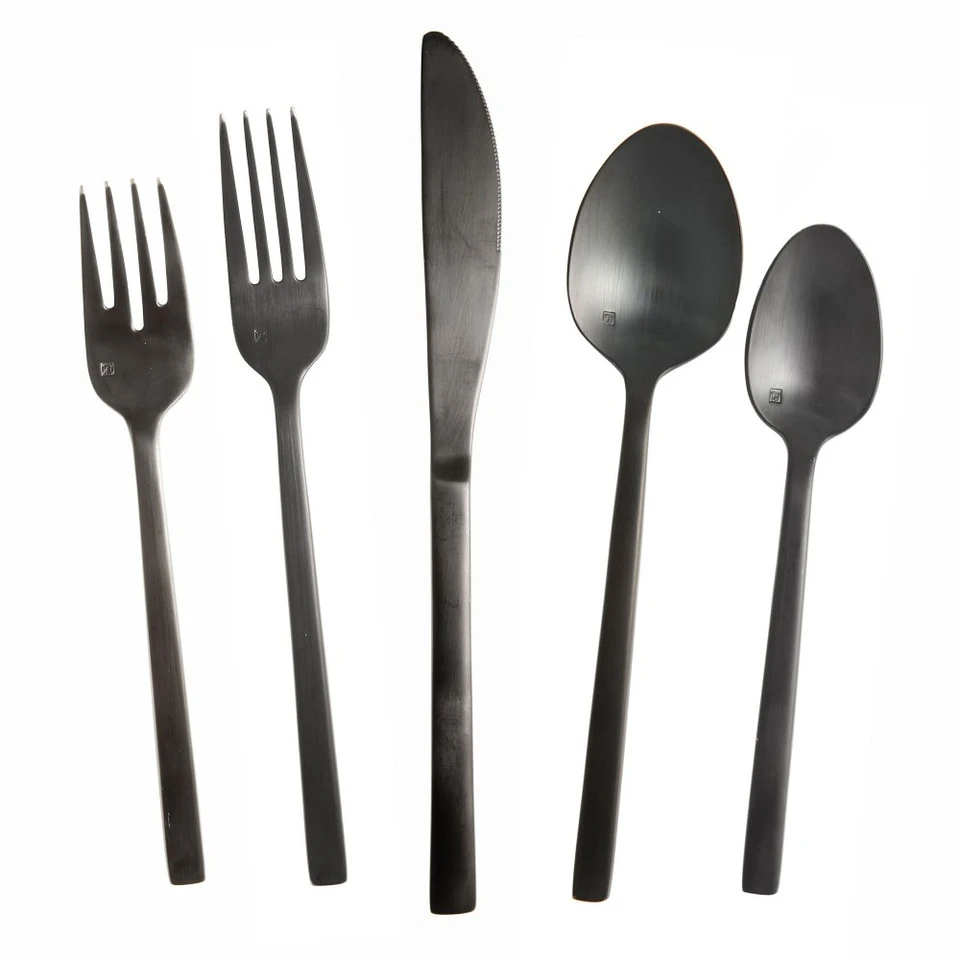 Clean lines and squared corners give this cutlery an appealing blend of versatility and modern style. The substantial stainless steel utensils have a brushed black finish that allows them to pair easily with contemporary table settings as well as traditional dinnerware.
