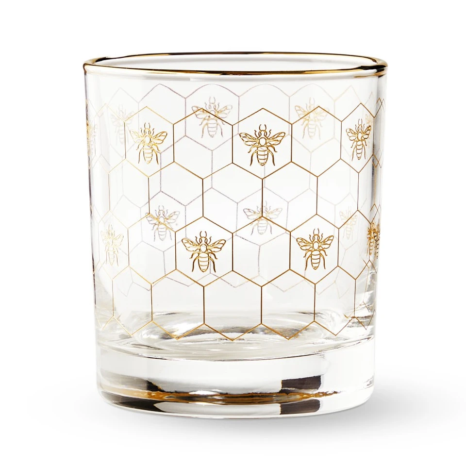 Create a buzz around your home bar. Crafted by Turkish artisans, our double old-fashioned glasses are adorned with golden honeybees, a handpainted honeycomb pattern and handpainted 24c-gold rims. The set of four lends elegant shimmer to liquor, classic cocktails and juice.