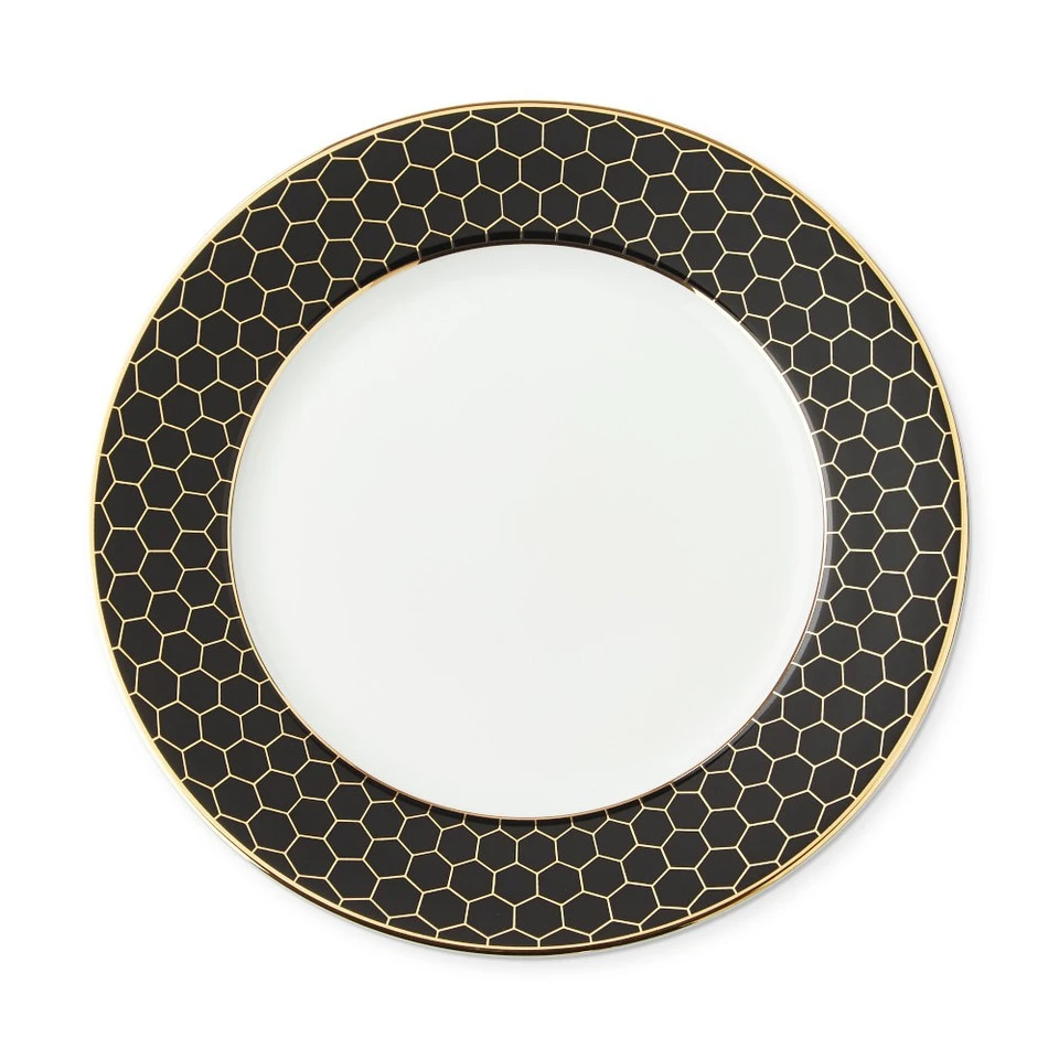 For a gathering that shimmers with warmth, set the table with our eye-catching collection. Bordered in black and adorned with 18 carat gold honeycombs and rims, these plates frame food beautifully and layer well with white-glazed porcelain dinnerware and servingware.