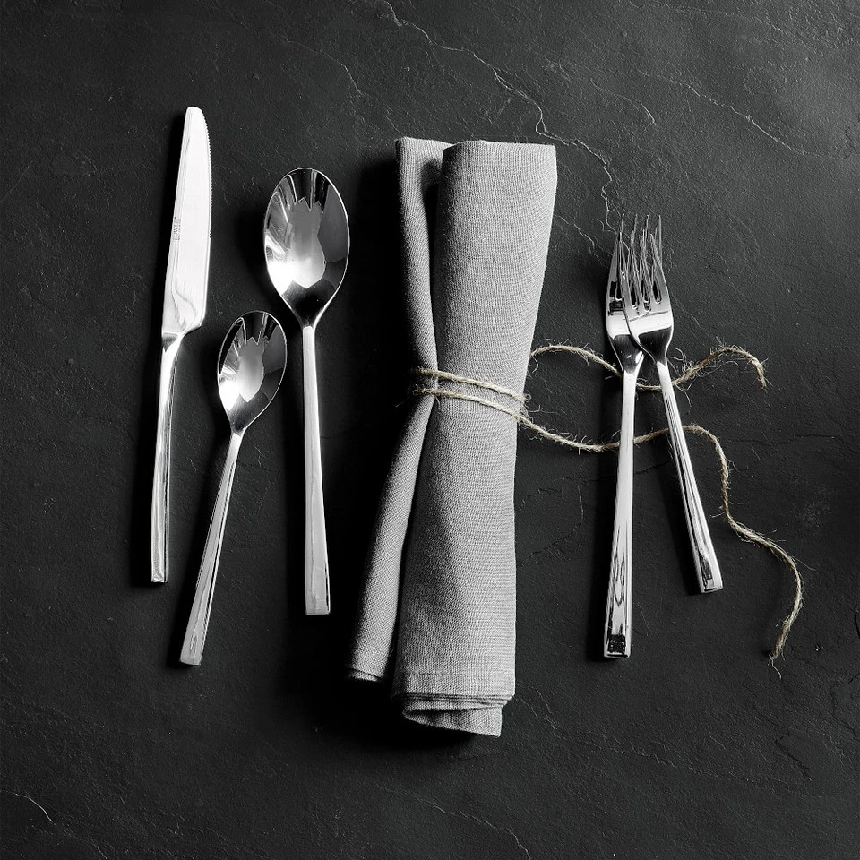 With sleek lines and squared ends, this beautifully crafted cutlery has decidedly modern appeal. The polished silver finish accentuates the simplicity of the design and makes a striking addition to contemporary tables. Crafted of weighty and durable stainless steel, the set is designed for lifetime’s worth of everyday meals and special occasions.