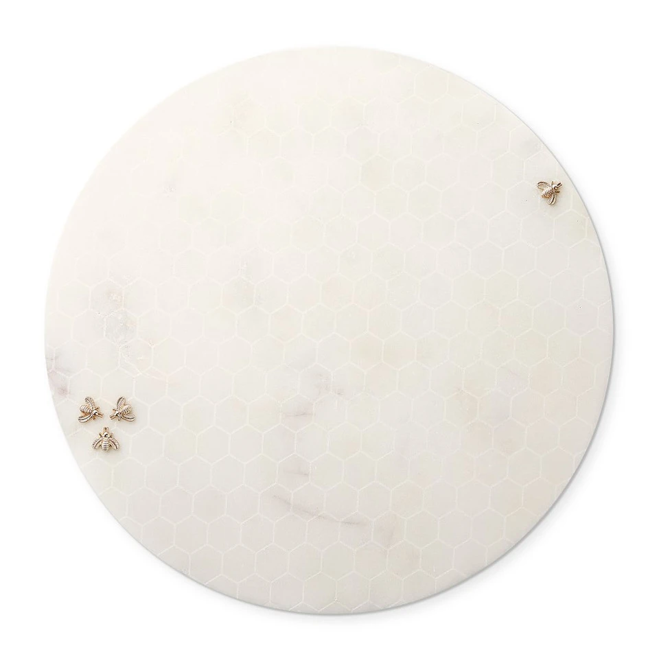 Add a sweet touch to gatherings with a marble cheese board adorned with golden bees. Finished with honeycomb-patterned etching, each hand-carved board is distinguished by rich natural hues and intricate markings. To help fruit and cheese stay cool, simply pre-chill the board in the refrigerator.