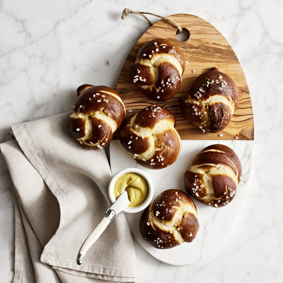 Pairing Greek white marble with the bold grain and richly varied colour of Italian olivewood, our oval board makes an eye-catching backdrop for everything from hors d’oeuvres to fresh fruit and baked treats. Slice and serve bread on the wood half, then arrange an assortment of cheeses on the cool marble. The organic variations in the natural materials give each board unique character.