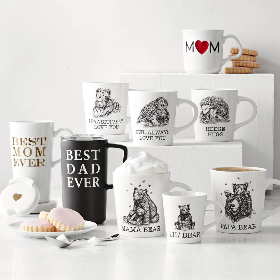 Our Papa Bear mug presents coffee, cocoa and tea in charming storybook style. Crafted of high-fired ironstone and finished with a white glaze, the mug features an illustrated black bear and cub on the outside with a black and gold bumblebee on the inside.