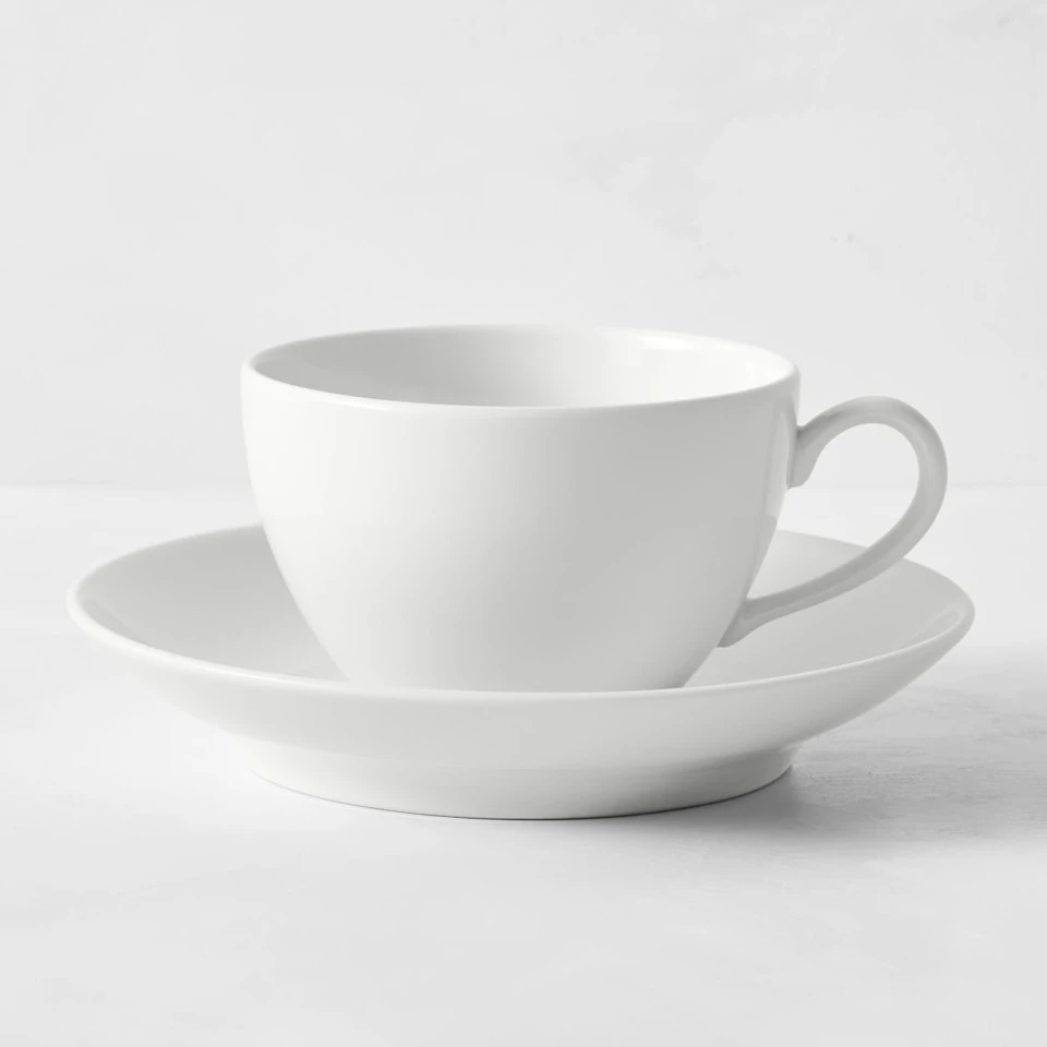 From France, this white porcelain dinnerware is as sturdy as it is stylish. The cups and saucers feature a classic coupe design with a gentle contour and sleek rim. Thanks to an innovative formulation of various clays, the porcelain’s delicate appearance belies its strength. Dressed up or down with formal or casual table linens, cutlery and glassware, this versatile dinnerware coordinates easily with patterned pieces. They’re made in France by Pillivuyt, a company respected for fine porcelain tableware since 1818. Microwavable and dishwasher safe. 236 ml cup and 16 cm saucer.