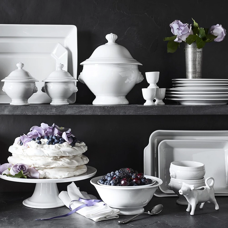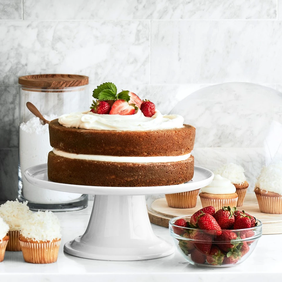 Like those seen in French patisseries, this cake stand is made for elevating all kinds of baked goods, from whole cakes to assorted cookies and pastries. Or use it for serving savoury bites like hors d’oeuvres, cheeses and tea sandwiches. Made of white porcelain with a gently raised rim, it creates an eye-catching display. Made in France by Pillivuyt, a producer of porcelain tableware since 1818.