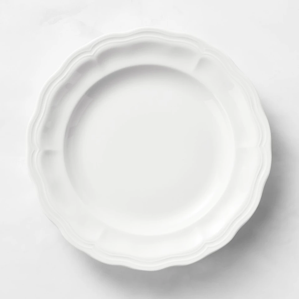 With its gently scalloped festonné rims, this porcelain dinnerware revives the elegant simplicity of a French classic. The pure white glaze complements food beautifully and suits casual as well as formal dining. The collection is made in France by Pillivuyt, a company respected for fine tableware since 1818. Microwavable and dishwasher safe. 29 cm dinner plate. A Williams-Sonoma exclusive.