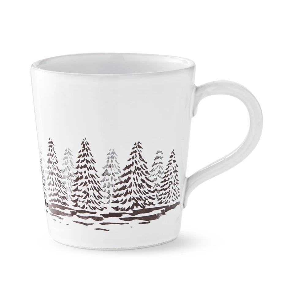 Our mug makes a warm addition to winter mornings and a thoughtful gift for holiday hosts. Crafted of recycled stoneware and glazed a glossy white, it presents favourite hot beverages surrounded by a forest of snow-laden pines or flutter of snowflakes.