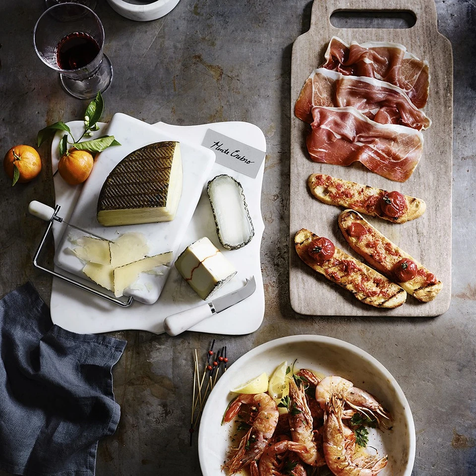 At once practical and elegant, white marble is ideal for serving cheese and fruit because it is naturally cool to the touch. Our handcrafted board is shaped with a flourish and polished to a high shine to set off and serve cheeses and accompaniments beautifully.