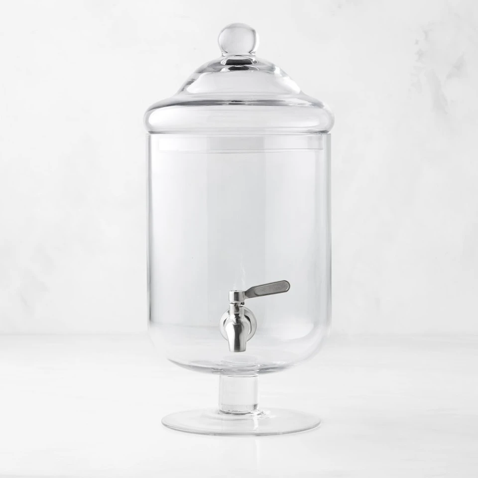 Handcrafted of mouth-blown glass, our dispenser makes an appealing display for chilled beverages and welcomes guests to help themselves. Thanks to a full-width lid, it’s easy to fill the spacious container whether you’re pouring in punch, adding sliced fruit or replenishing the ice. The well-balanced foot raises the stainless-steel spigot to cup height for easy dispensing, without drips.