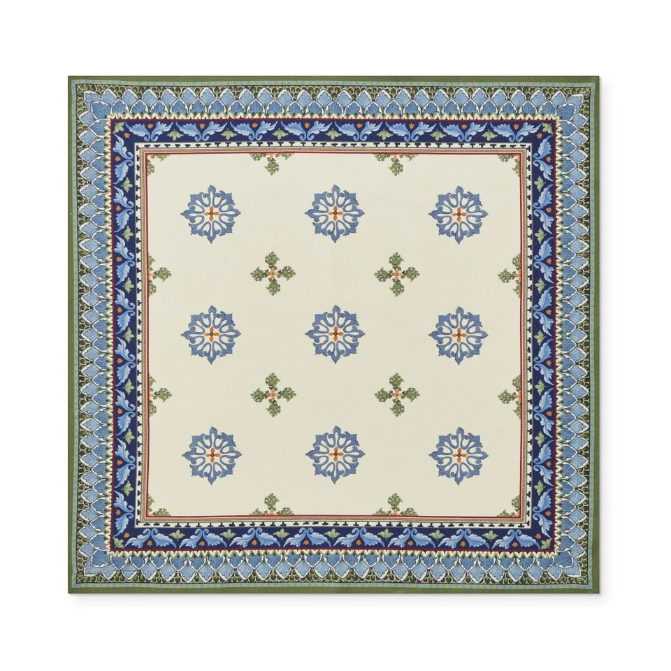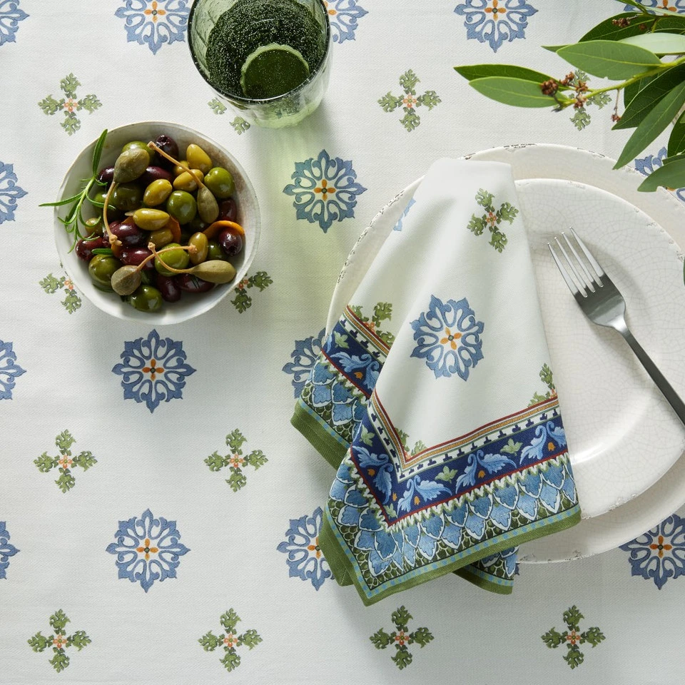 Woven for us in Italy, our OEKO-TEX®-certified cotton twill napkins bring Mediterranean style to your dinner table. Their nature-inspired motifs are borrowed from traditional Sicilian ceramics in warming shades of blue and green on a solid white ground.