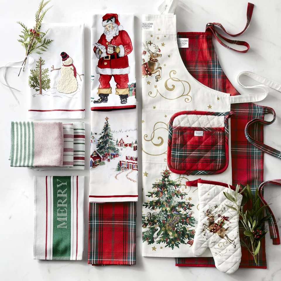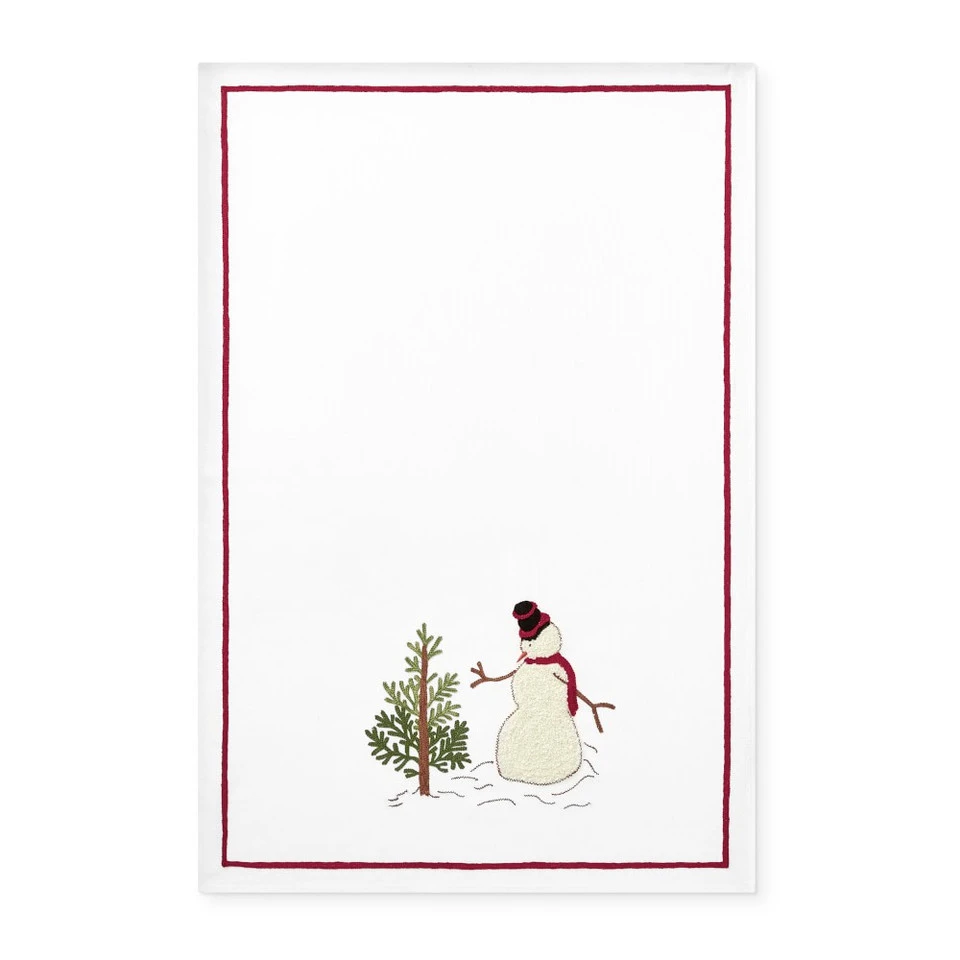 Embroidered with a serene scene, our cotton tea towels bring nostalgic, vintage style to the festive kitchen. A snowman and tree are rendered in colour-rich threads on a white background while a piped red border offers vivid definition.