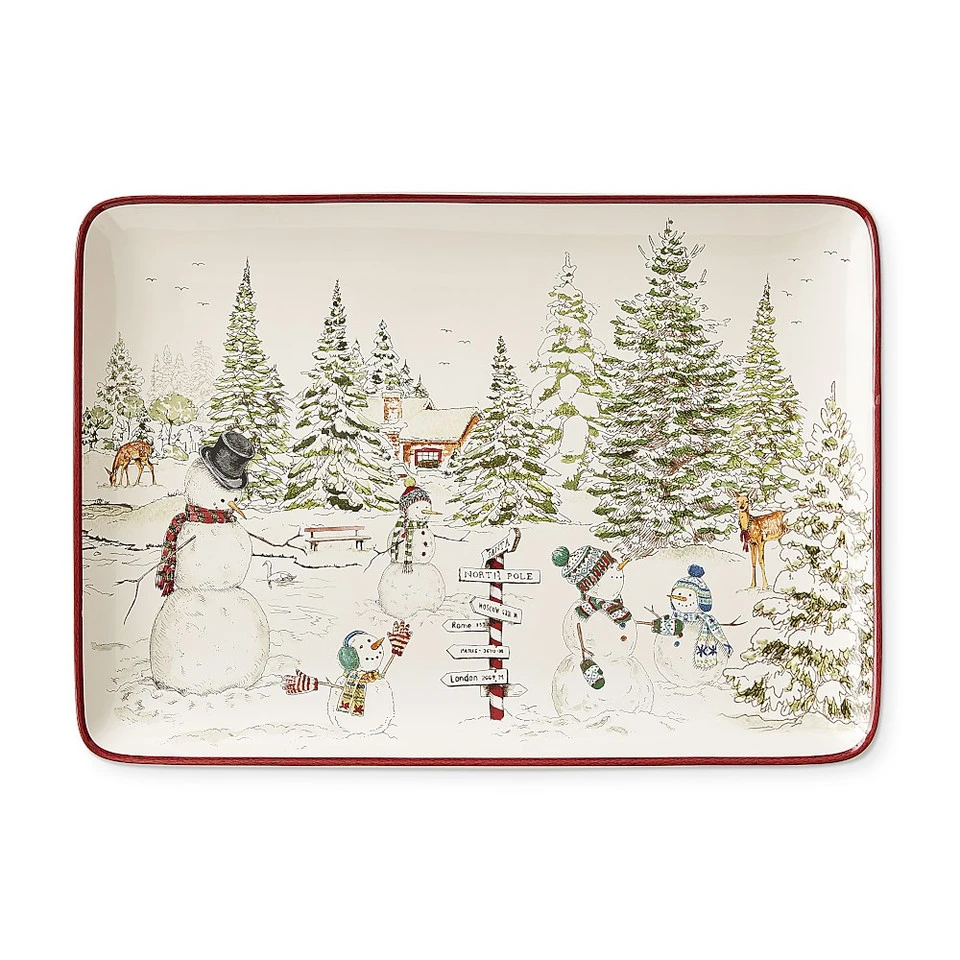 Embellished with cheery snowmen in scarves and hats, this vintage-inspired platter brings charm to casual festive gatherings. Large enough to serve mains or a medley of seasonal desserts, the tray is crafted of durable stoneware and will be enjoyed for merry years to come.