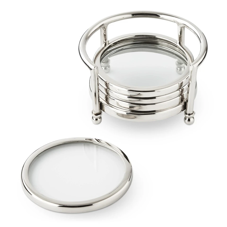 Inset with a thick plane of glass, our polished coasters add gleaming art deco style to entertaining. The footed holder lends elegant architectural detail to the set and keeps coasters stacked between drinks. Each piece is machine-shaped of durable stainless steel, and then plated for a lasting finish.