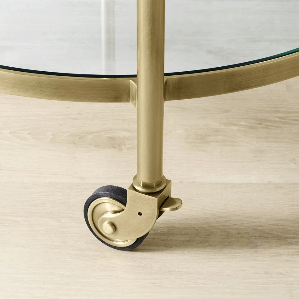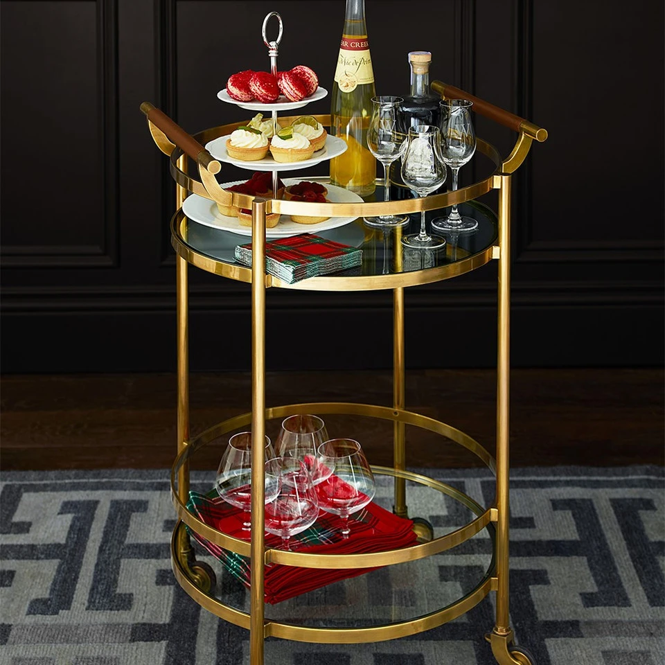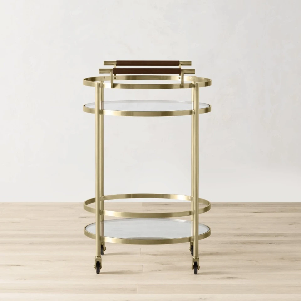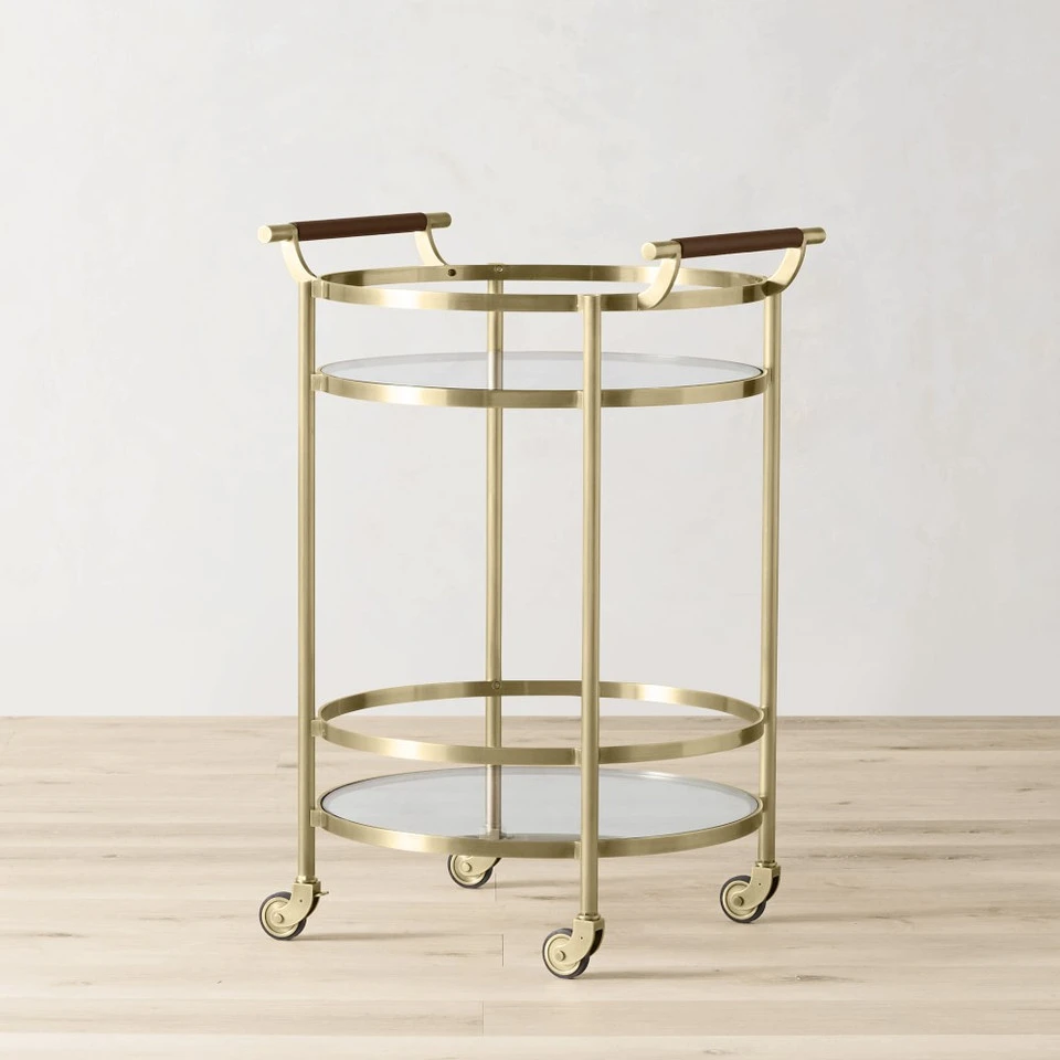 Mid-century-inspired design and highly functional features earn this entertaining essential a permanent place in the dining room, living room or den. Its strong steel frame is inset with two glass shelves surrounded by high gallery rails to secure bottles and glassware in transit. Expertly finished in your choice of antique brass, complemented by leather-wrapped handles.