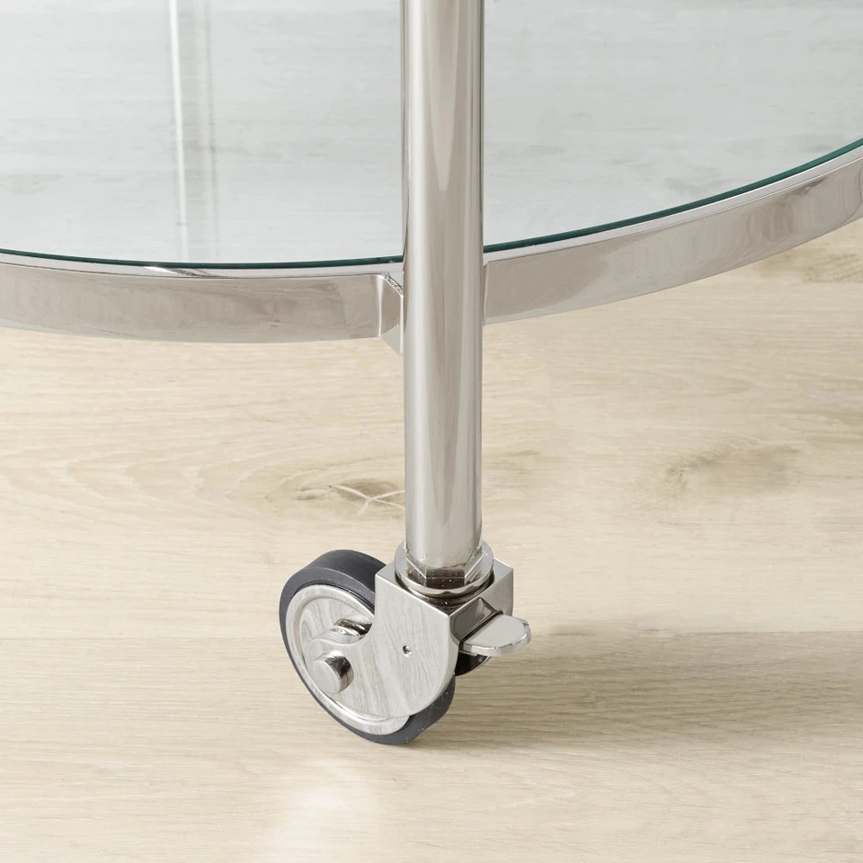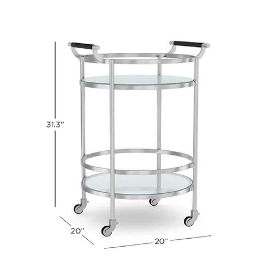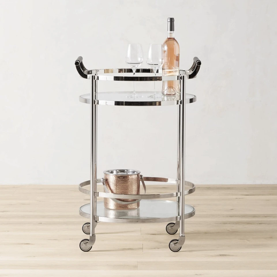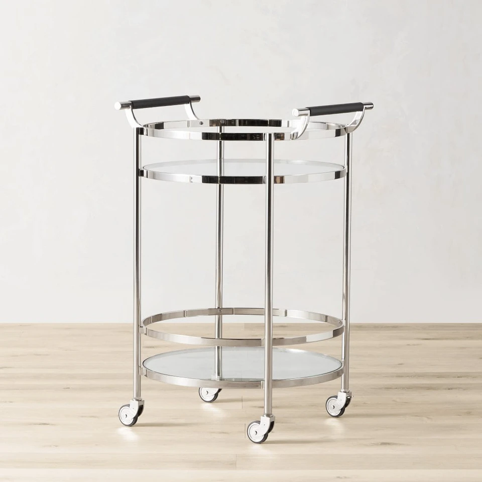 Mid-century-inspired design and highly functional features earn this entertaining essential a permanent place in the dining room, living room or den. Its strong steel frame is inset with two glass shelves surrounded by high gallery rails to secure bottles and glassware in transit. Expertly finished in your choice of antique brass, complemented by leather-wrapped handles.