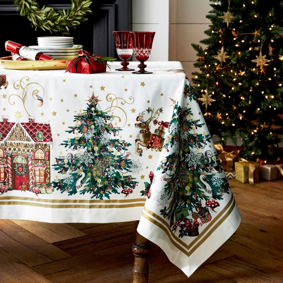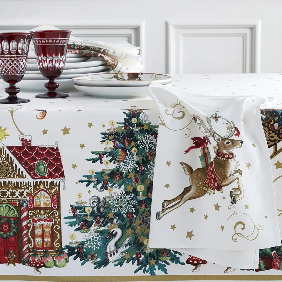 Celebrate the magic of the season with a tablecloth inspired by the legendary 19th-century poem “A Visit from St. Nicholas”. Surrounding a centre of festive gold stars, the border is embellished with a vintage-style collage featuring St. Nick and his sleigh, prancing reindeer and decorated Christmas trees.