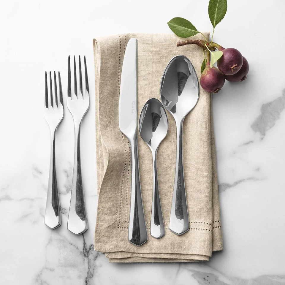 A clean, contemporary design with traditional accents, this gleaming cutlery was created by award-winning English designer Robert Welch. The finely balanced pieces have a pleasing weight and strength and V-shaped bolster. The spoons and forks are crafted of 18/10 stainless steel, while the knives are forged from a single ingot of hardened stainless steel for a well-honed cutting edge. The five-piece place setting includes a 20 cm dinner fork, a 18 cm salad fork, a 24 cm dinner knife, a 20 cm soup spoon and a 16 cm teaspoon. Dishwasher safe. Made in Vietnam. A Williams-Sonoma exclusive.