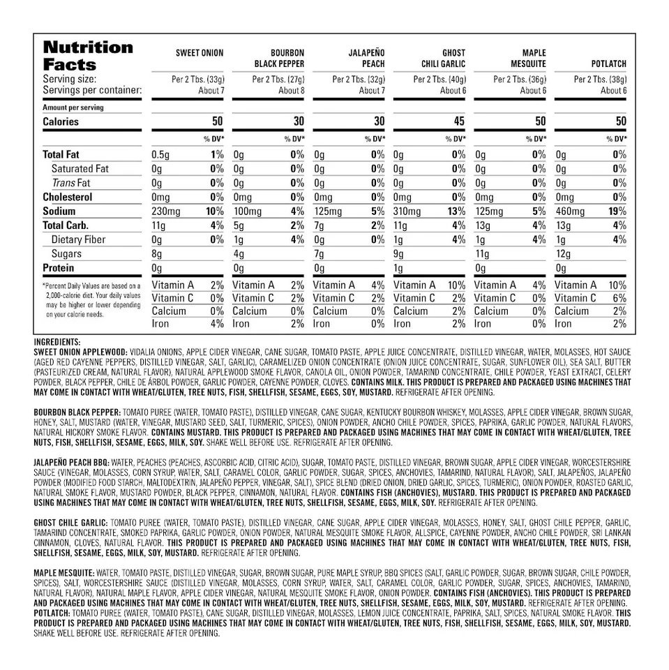 - Sweet Onion Applewood: Vidalia onions, apple cider vinegar, cane sugar, tomato paste, apple juice concentrate, distilled vinegar, water, molasses, hot sauce (aged red cayenne peppers, distilled vinegar, salt, garlic), caramelized onions (onion juice concentrate, sugar, sunflower oil), sea salt, butter (pasteurized cream, natural flavour), natural applewood smoke flavour, canola oil, onion powder, tamarind concentrate, chile powder (chile pepper, garlic, spices), yeast extract, celery powder, black pepper, chile de arbol powder, garlic powder, cayenne powder, cloves. Contains milk.